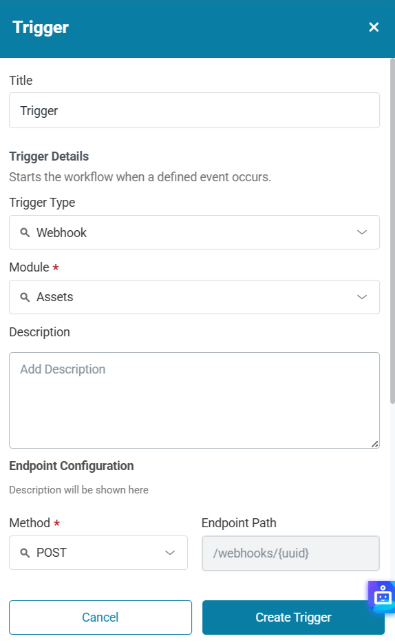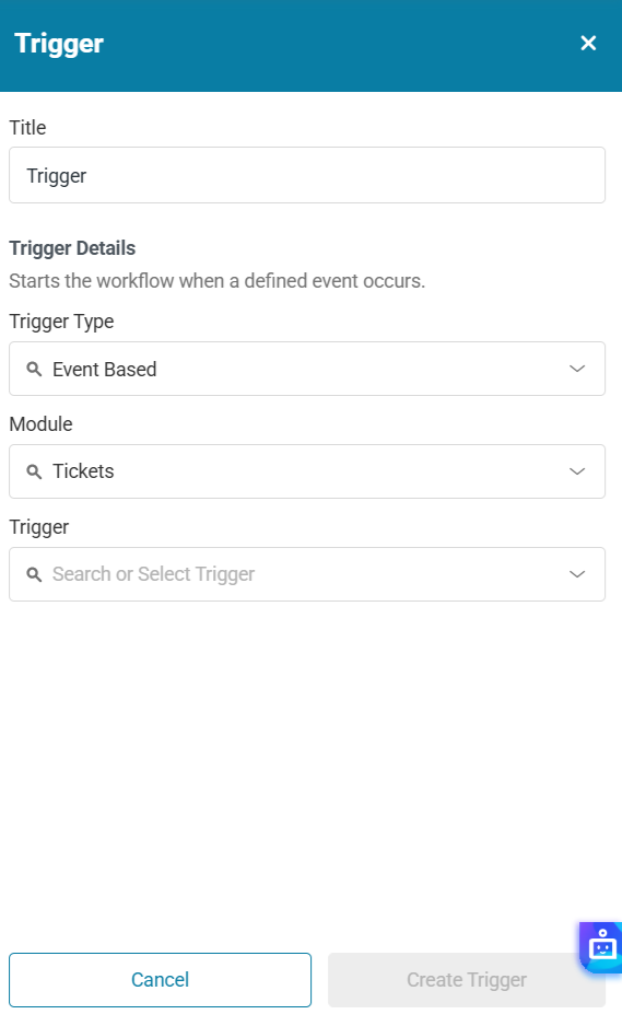 - It will display a modal where you need to enter the Title and select the Trigger Type and enter the relevant Module.