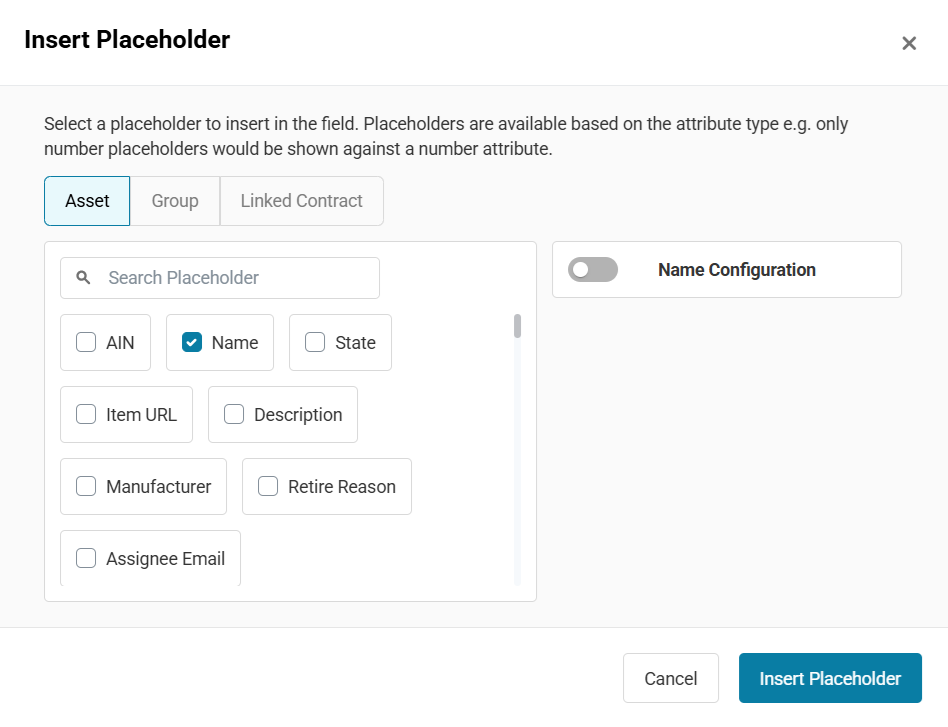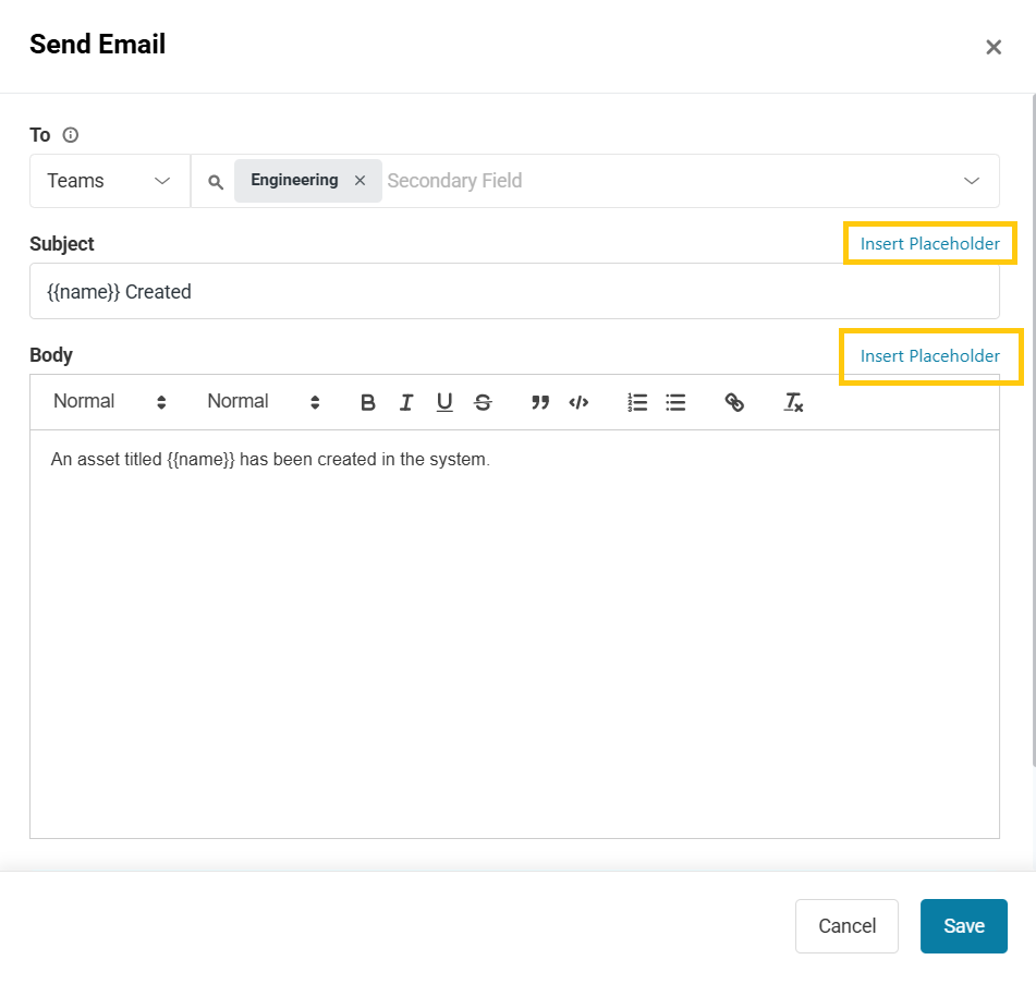 So, for example, if you want the subject field to include the name of the asset created from the example above. You can add the relevant placeholder to both the Subject and Body of the emails sent. Refer to the images below: