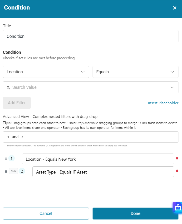 Continuing our example, when an asset is created, the above condition will be true only when it is located in New York and it is an IT Asset.