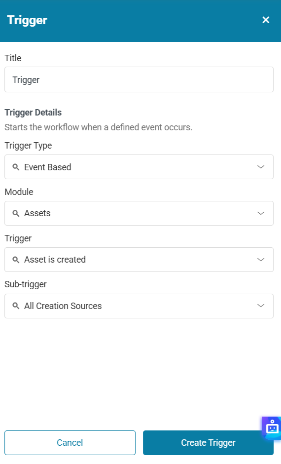 Let’s suppose you want to set up an automation where, if an asset is created, you receive an email for it. So you set up a trigger for when an asset is created, as shown above.