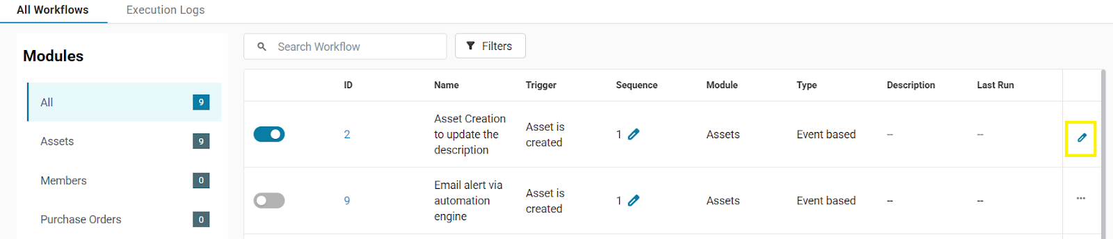 - Edit: Click the Edit icon at the end of a row to open that workflow in the visual editor.