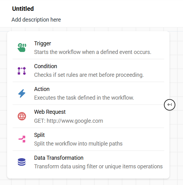 Enter a Title (required) and optional Description. Then start building by clicking and dragging the following nodes onto the canvas.