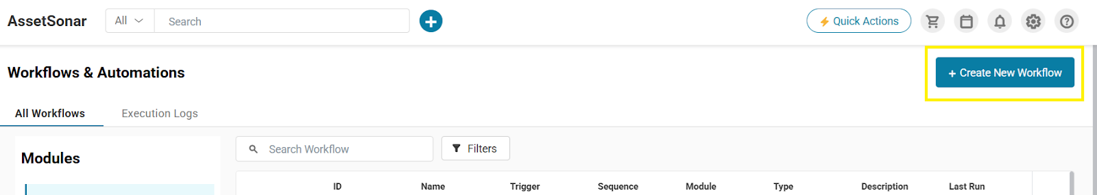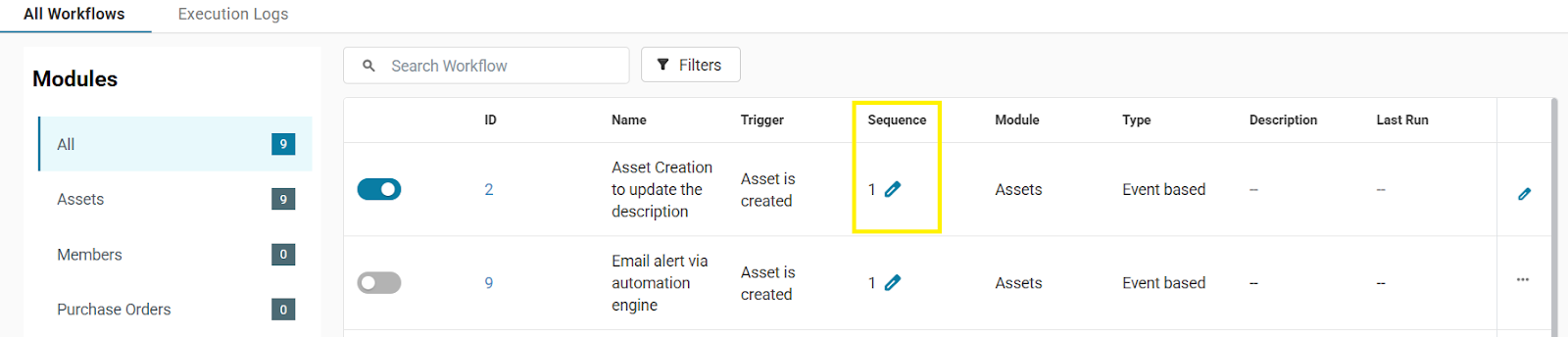 - Reorder Sequence: Edit the Sequence number inline to adjust execution priority for workflows sharing the same trigger. Lower Sequence number means relatively higher priority. So, for multiple workflows with the same triggers, the workflow with the lower sequence will be executed first.