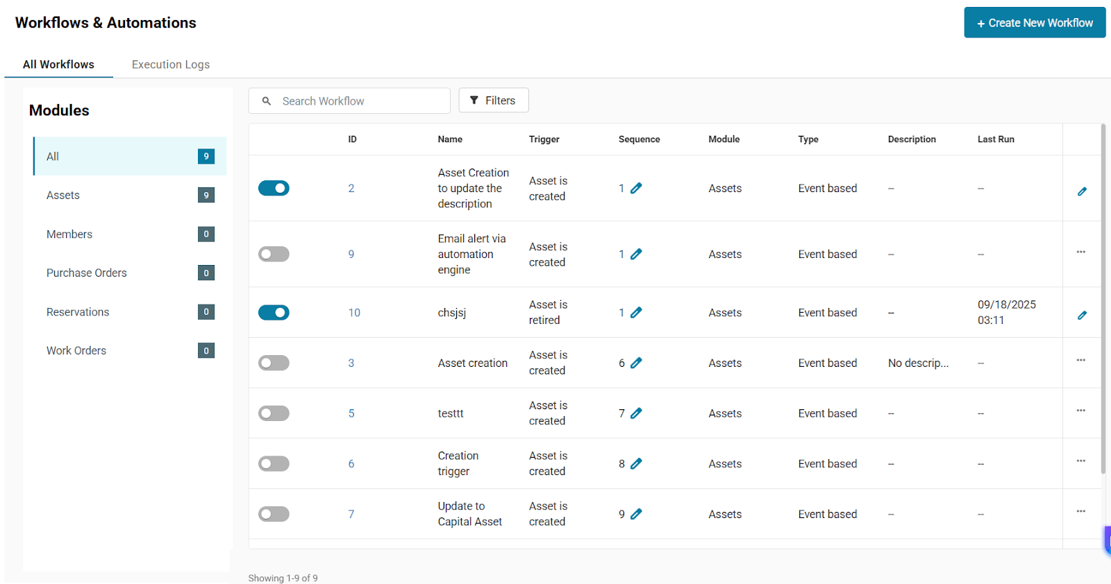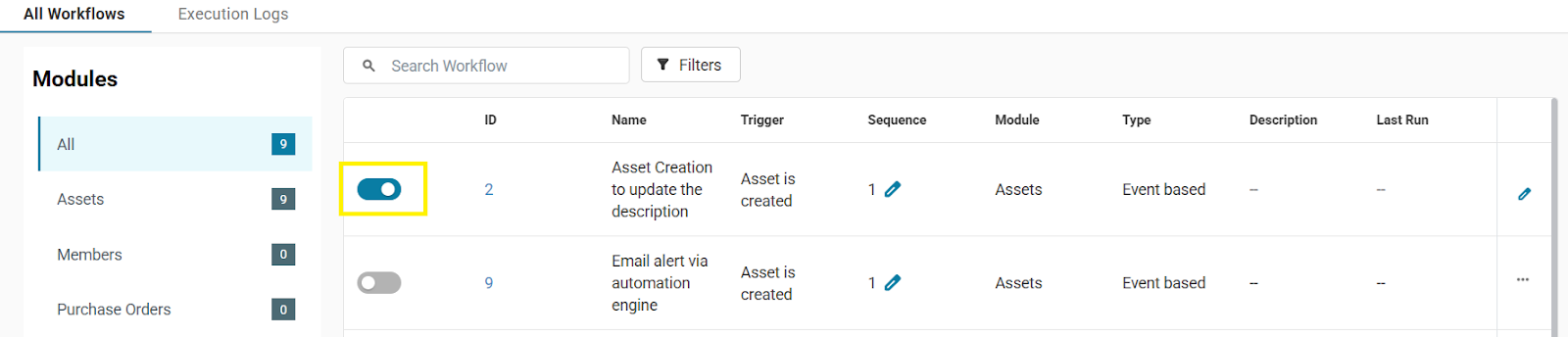 - Activate/Deactivate: Toggle the status switch beside each workflow to instantly enable or disable it.