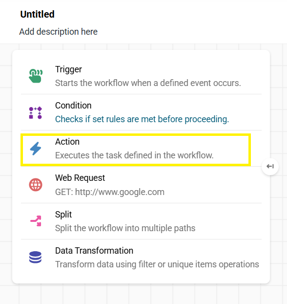 - Click the Action icon (shown below) and drag it onto the canvas.