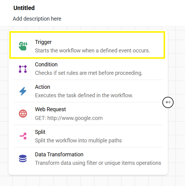- Click the Trigger icon (shown below) and drag it onto the canvas.