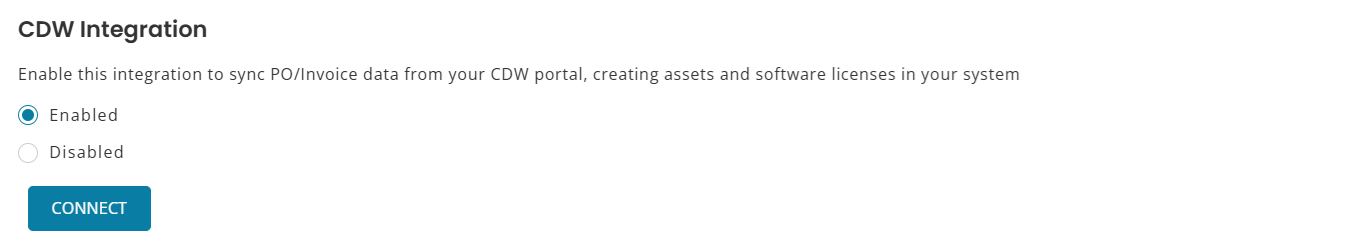Go to Settings → Integrations → Procurement Integration → CDW Integration, click Enabled, and save the settings.