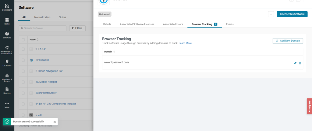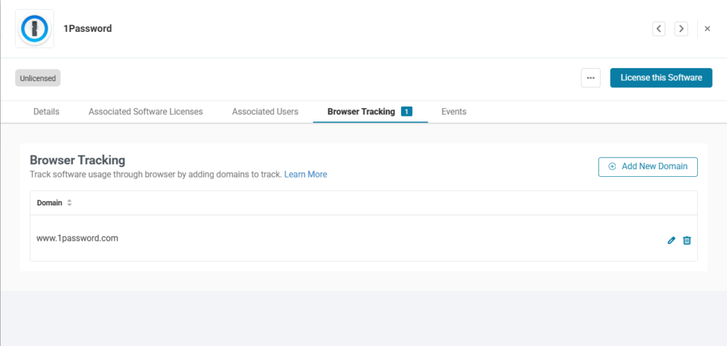 You can also track the browser activity for each software application tracked in AssetSonar. From the software detail page of the relevant software application, go to the Browser Tracking tab. Here, you can add URLs of the domains you want to track through this functionality. Here is a screenshot of the Browser Tracking tab for the 1Password.