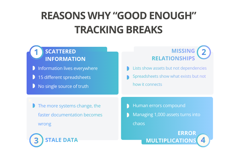 “Good enough” tracking often relies on manual updates. Someone has to remember to update the wiki after a change or refresh the spreadsheet when a new VM gets created. As the volume of changes grows, this becomes a battle you can’t win.