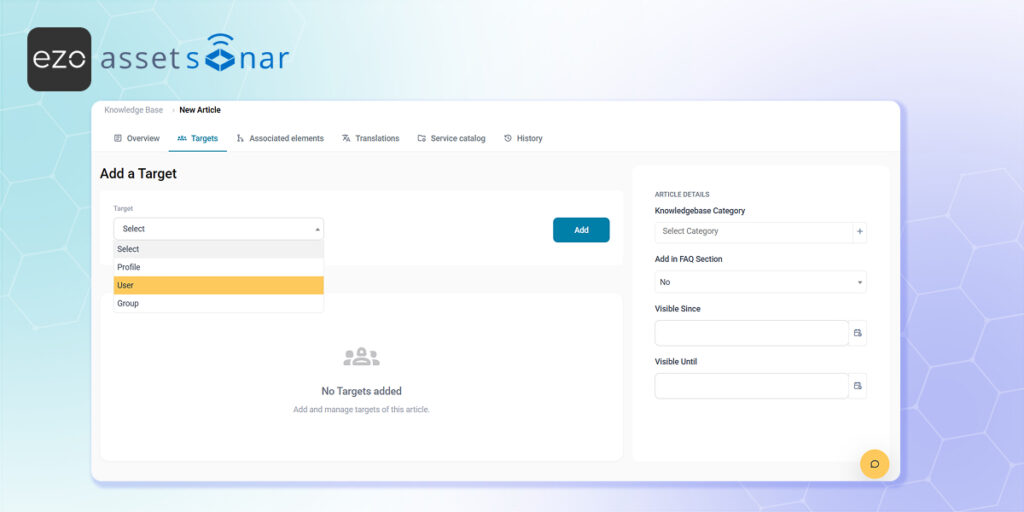 - Access the Targets Tab: Navigate to Tools → Knowledge Base and open the specific article you want to restrict, then click on the Targets tab.