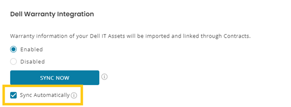 To enable the Dell warranty integration, go to Settings → Add Ons → Dell Warranty Integration → Enabled.