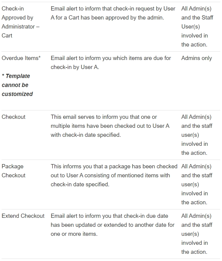 Following table details how each type of check-in/checkout email alert functions in our app: