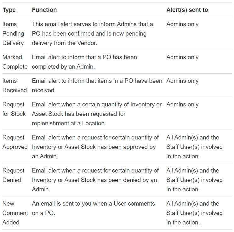 - Staff Users receive emails they’ve subscribed to only when they’re involved in the action and have alerts enabled from More → Alerts → Staff Alerts.