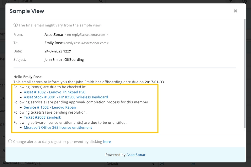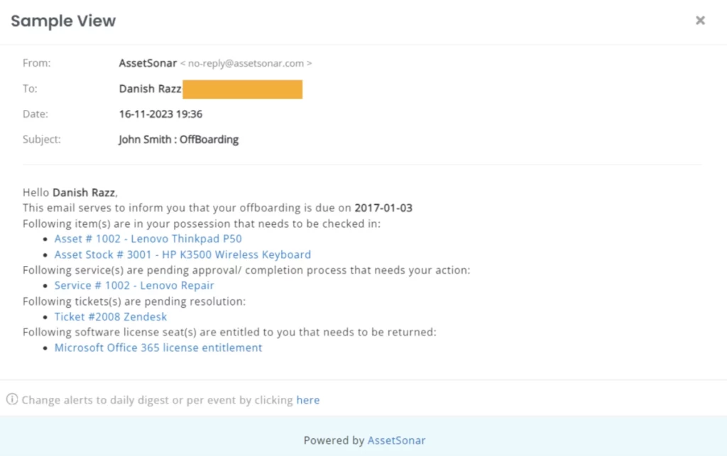 Always stay informed about employee offboarding by proactively setting up notifications about employee exit dates with AssetSonar. Offboarding workflows in AssetSonar empowers Admins to get alerts about assigned IT assets and software license entitlements as well as pending tickets, issues, or services associated with the exiting employee(s).