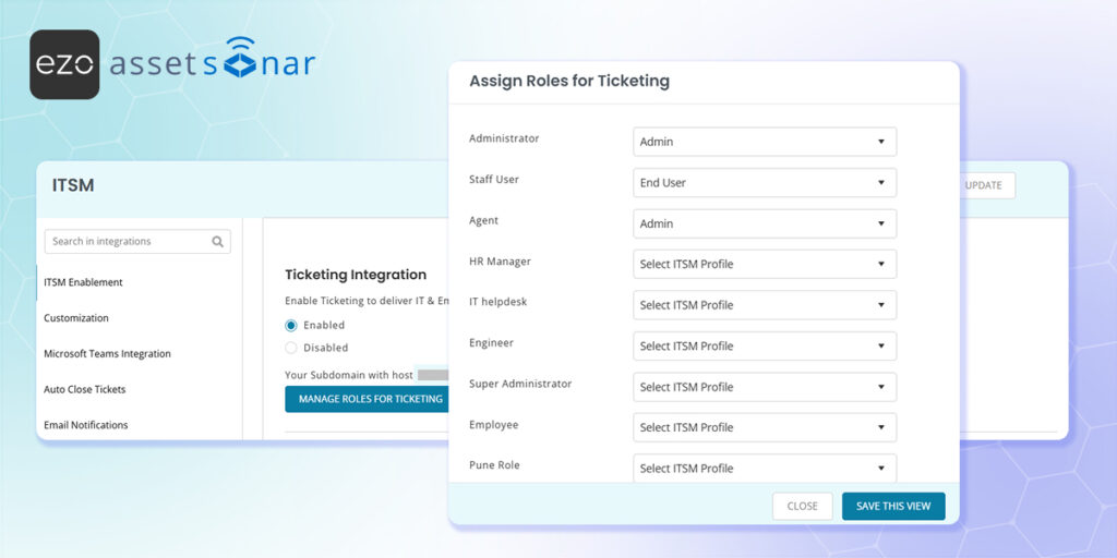 - Assign Roles: Once enabled, a Manage Roles for Ticketing option will appear. Click this to open a modal where you can assign specific access levels (Admin, Agent, or End User) to your required users, then click Save This View.