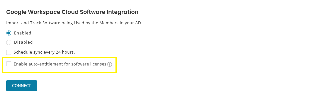 To enable this setting, go to Settings → Integrations → Google Workspace Cloud Software Integration and click “Enable auto-entitement for software licenses.”
