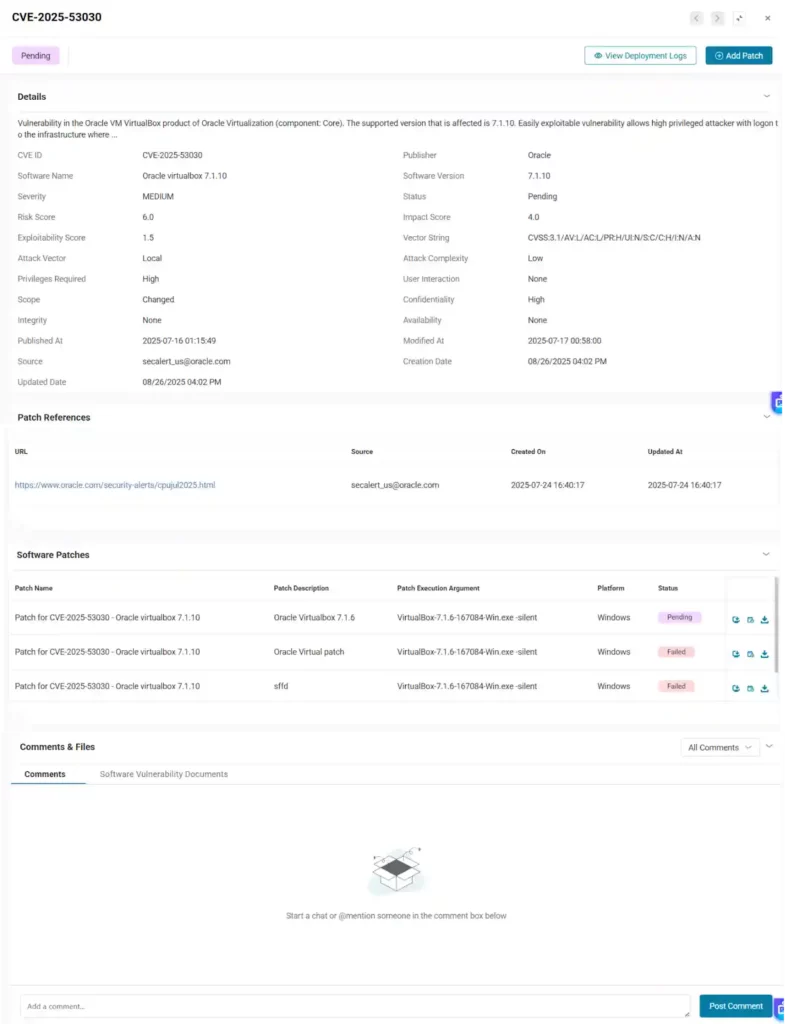Once added, the patch appears in the Software Patch section of the relevant vulnerability and becomes available for deployment.