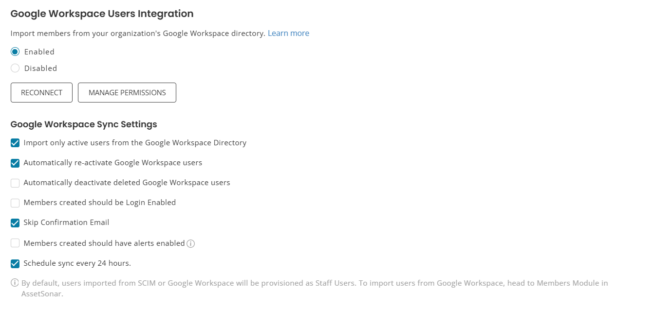 Enabling this setting will automatically run a sync every 24 hours and reflect changes made to users in the Google Workspace directory within AssetSonar.