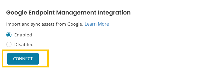To enable the integration, follow the pathway: Settings → Integrations → Mobile Device Management & Network Discovery → Google Endpoint Management Integration → Enabled, and click ‘Update’.