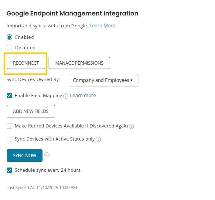 A: You can update the credentials by going to Settings → Integrations → Mobile Device Management & Network Discovery → Google Endpoint Management Integration → Reconnect.