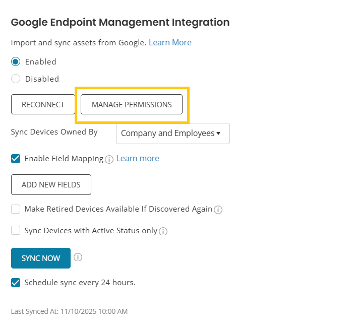 When enabling the Google Endpoint Management integration, click on Manage Permissions to customize what types of data are synced into AssetSonar. These options help you fine-tune the sync behavior to match your organization’s IT policies.