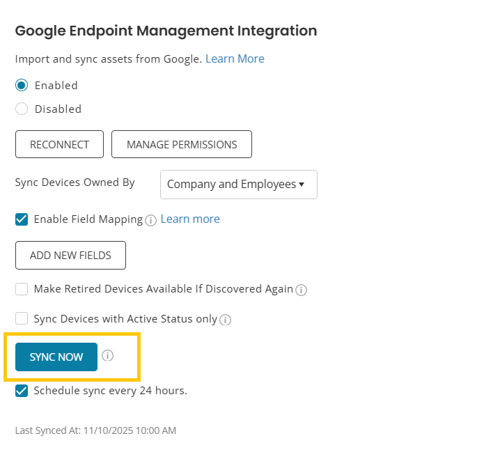 To import data from your Chromebooks and mobile devices into AssetSonar, click on the ‘Sync Now’ button that shows up after enabling the integration.