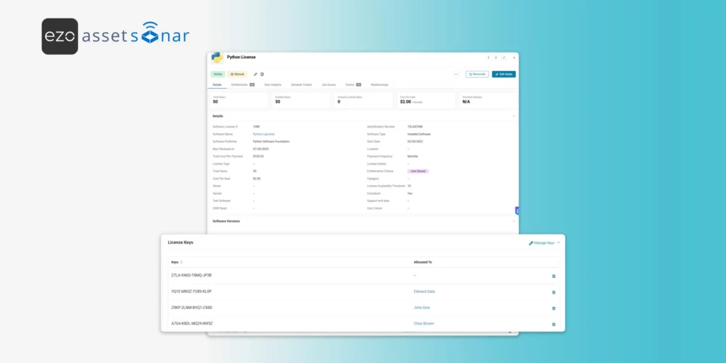 Once you have successfully entered the license keys, they’ll start showing up under the ‘License Keys’ table on the corresponding software license details page.