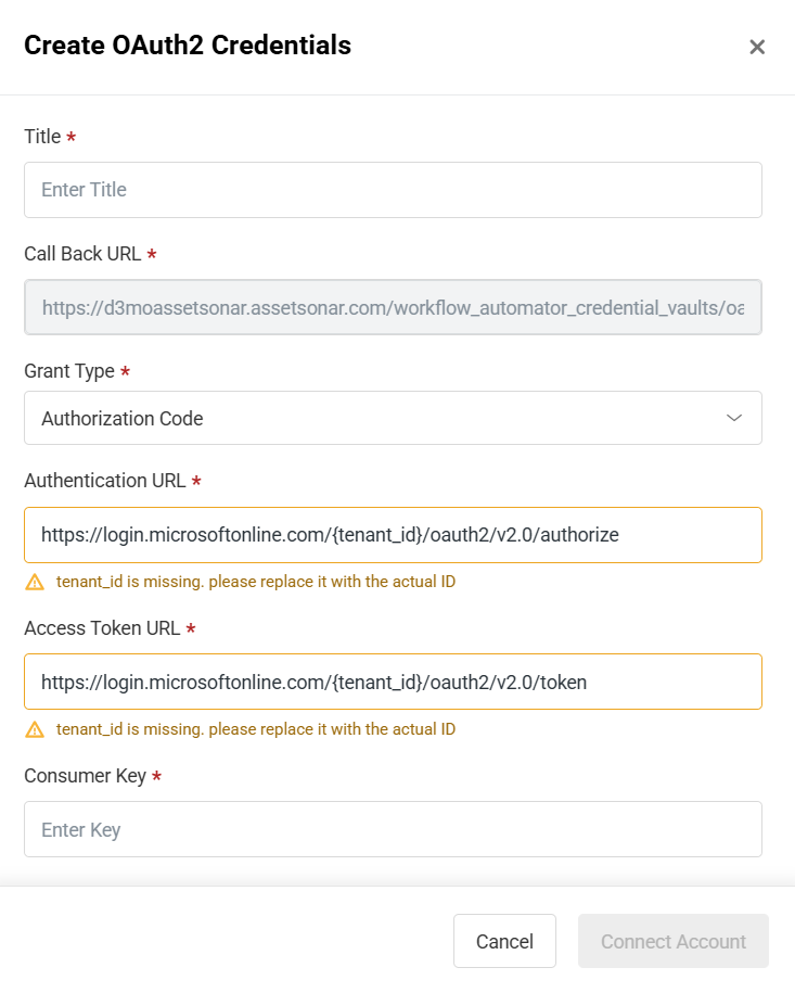 - When creating new credentials, AssetSonar will prompt you for the specific authentication details required by that third-party app (for example, OAuth 2.0). Once saved, these credentials can be reused across any workflow.