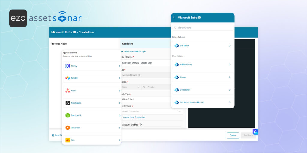 - Example: If your workflow triggers when a new Employee is created in AssetSonar, you can pass {{member.first_name}} and {{member.last_name}} directly into the MS Entra “Create User” node.