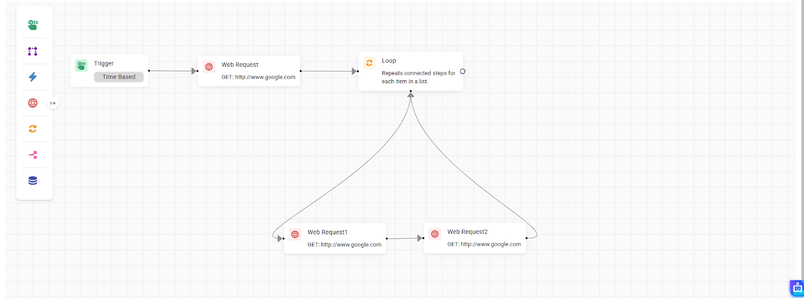 - Drag a connection from the “Loop” end of the Loop Node to your first inner action (e.g., a Web Request).