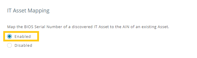 AssetSonar typically records a host of data fields captured from your Jamf account. These include IP and Mac Addresses, BIOS and input device details, etc. You can also map the BIOS serial number of a discovered IT asset to the AIN of an existing asset by enabling this setting: