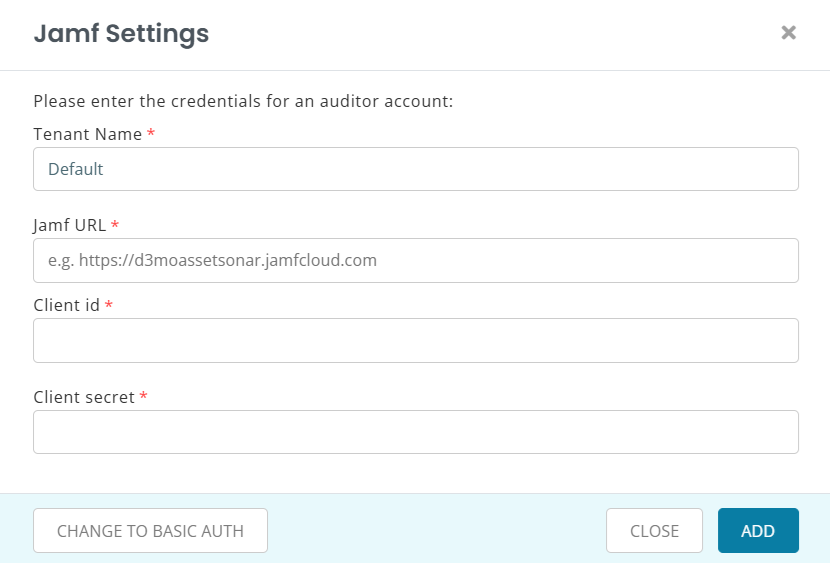 Note: Some username/password combinations fail to generate valid Base64 strings due to a Jamf-side issue. If this occurs, either adjust the password or switch to the API Client method. Additionally, you must have the role of an Auditor in your Jamf account to enable the integration.