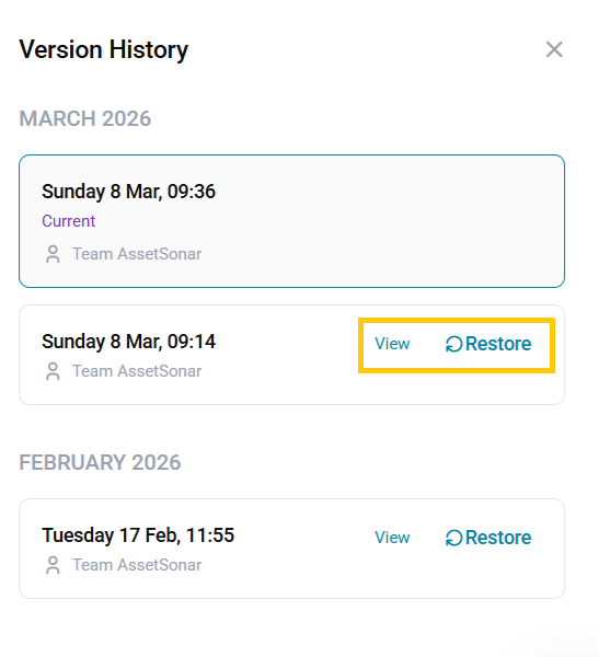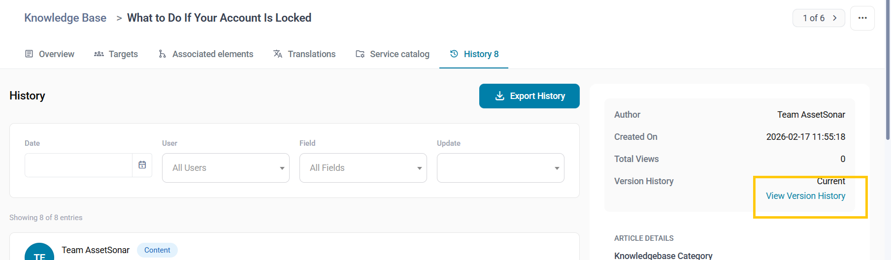 - Restore Previous Versions: To manage the actual text content, click the View Version History link located in the side panel to display a list of all previous iterations. You can click View next to any specific version to see exactly what it looked like, or hit the Restore link to instantly revert the article back to that older state.