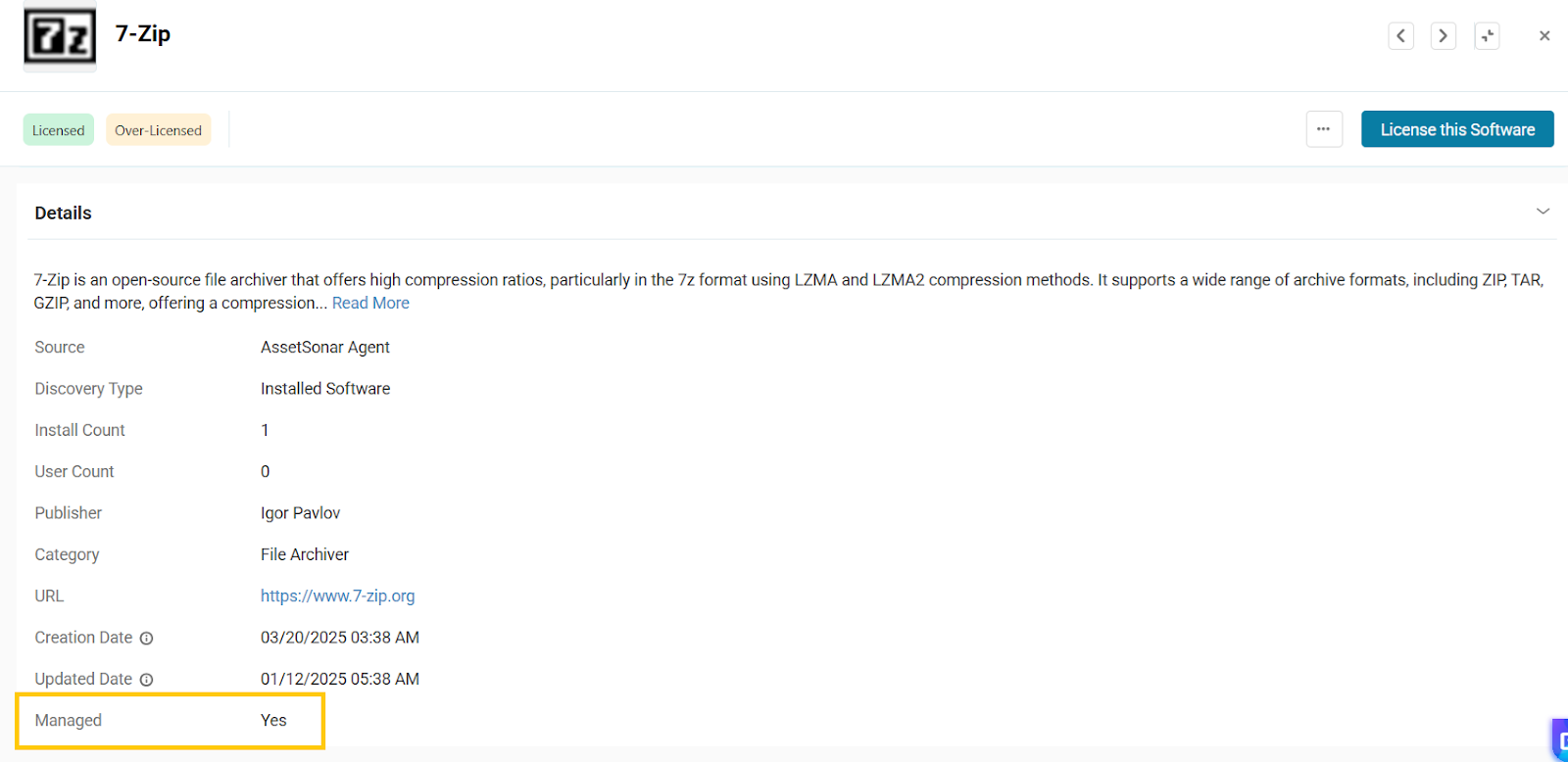 Each software record in AssetSonar includes a Managed field with two values: Yes or No.