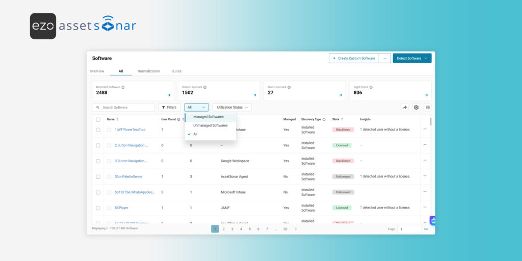 With the Managed Software view, you can separate business-critical, licensed, and blacklisted applications from the noise of other discovered software in EZO AssetSonar. This helps you streamline reporting, simplify audits, and manage software usage more effectively.