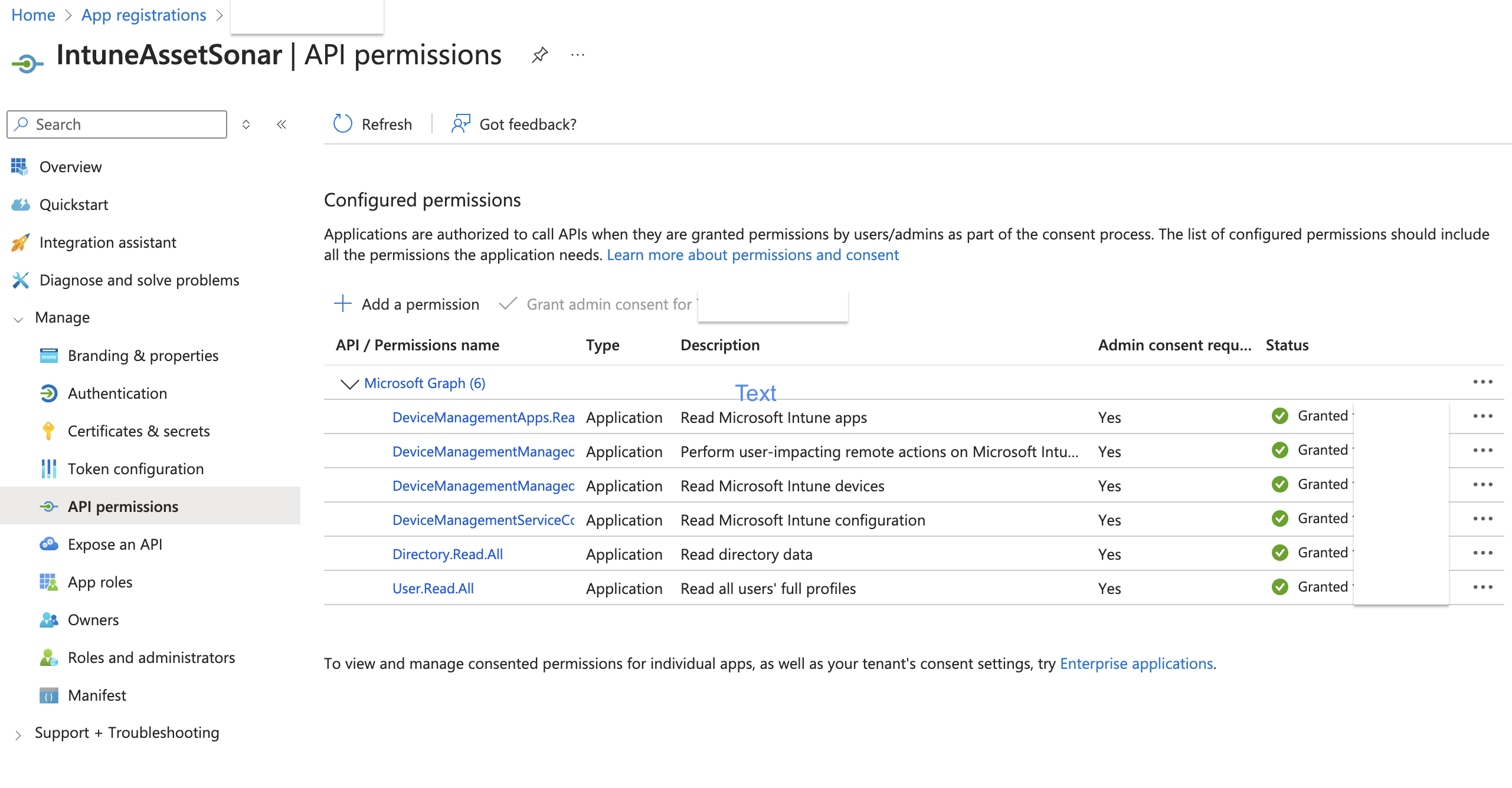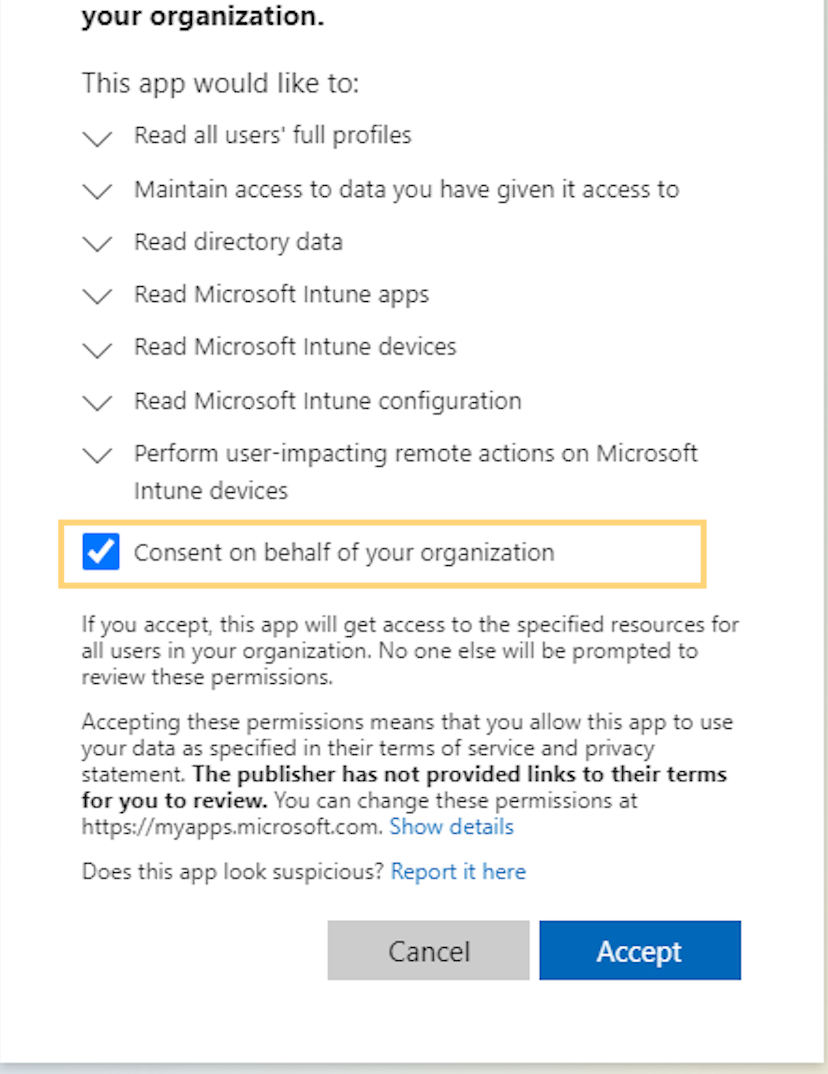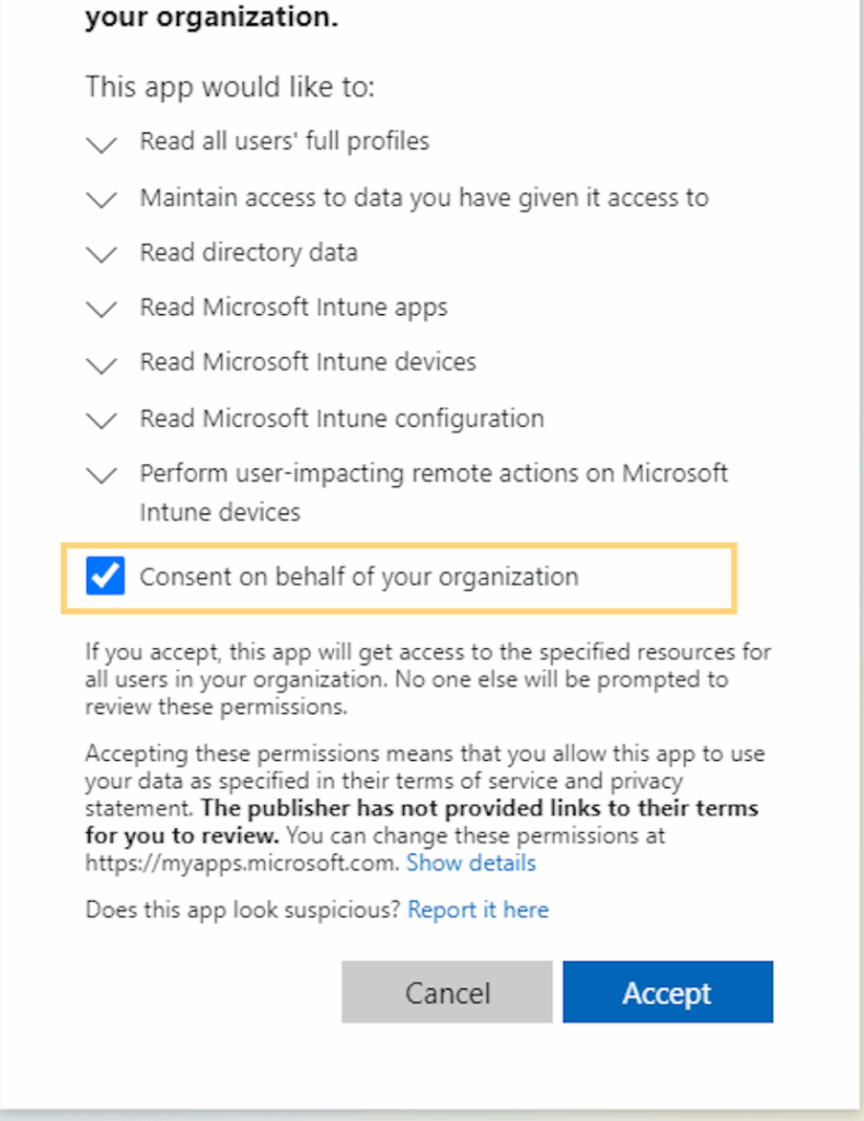 Choose the desired commands from the dropdown; you’ll be redirected to the permissions page on Microsoft Intune. Here is a snippet of the page: