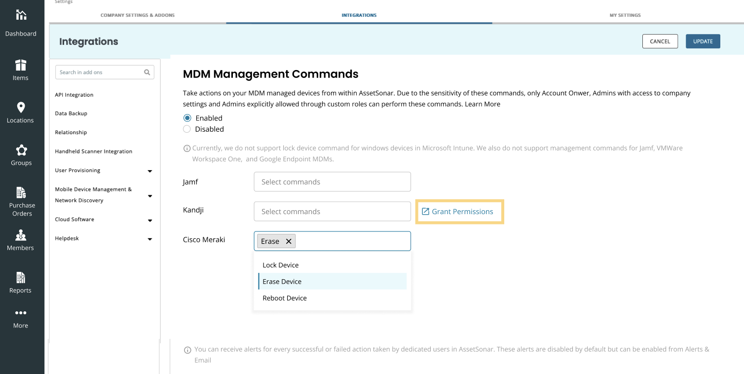 By enabling MDM Management Commands for Kandji, you can lock devices brought in through this integration. Choose the command from the dropdown and then click on ‘Grant Permissions’ button as shown: