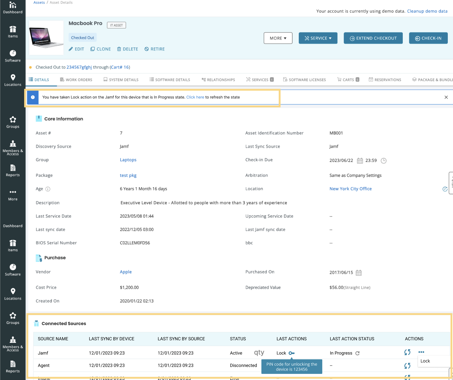 On an asset’s detail page, scroll down to the Connected Sources table. You’ll be able to view if any MDM actions have been performed on the asset and the status of these actions.