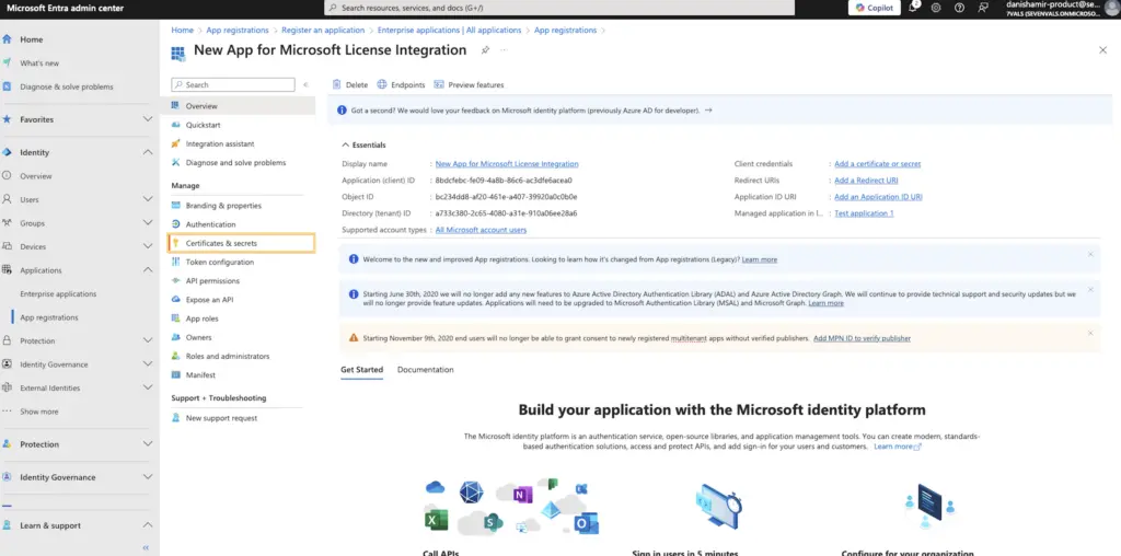 6. Click ‘Certificates and secrets’ to generate the Secret key.