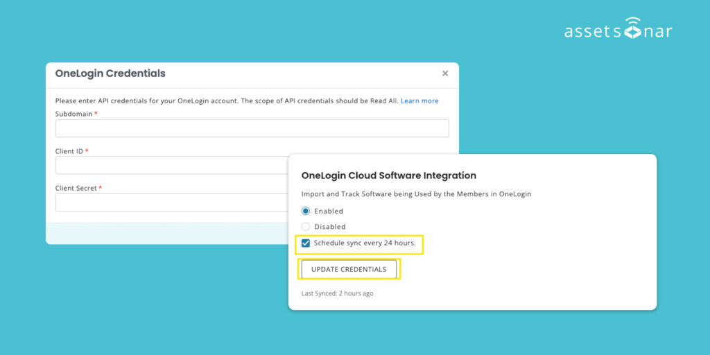 - Integrating AssetSonar with OneLogin allows you to centralize all your cloud software information. You can view the users associated with every software application and get more information on the software usage along with the last login information.