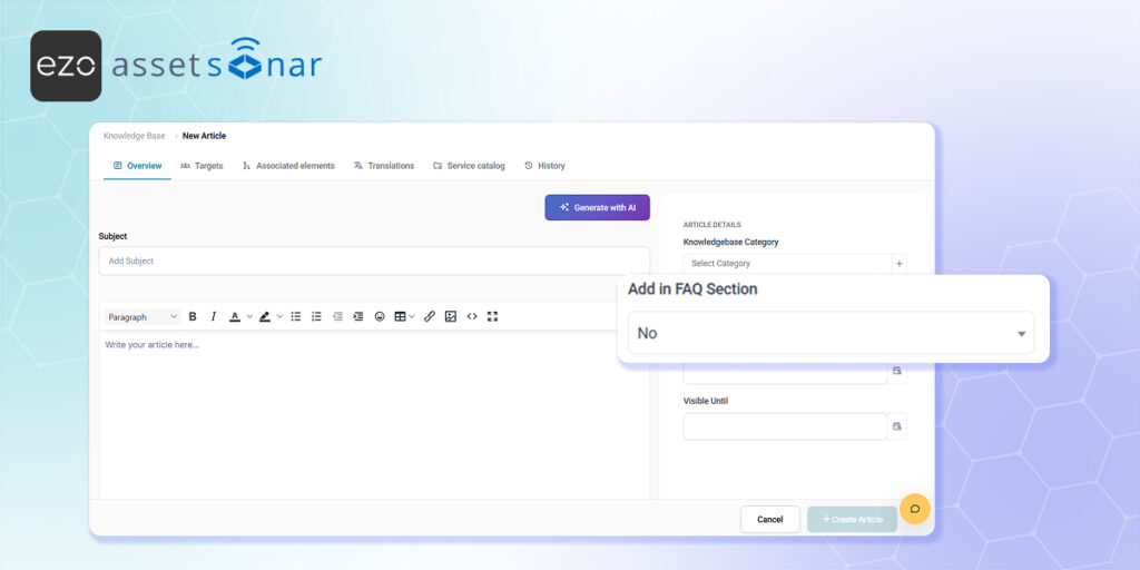 - Restrict for Internal Use: To keep the document strictly internal for your IT team, leave it out of the public FAQ. Instead, click on the Targets tab in the side panel. From there, you can select specific users, profiles, or groups (like “Admin” or “Technician”) to grant exclusive access.