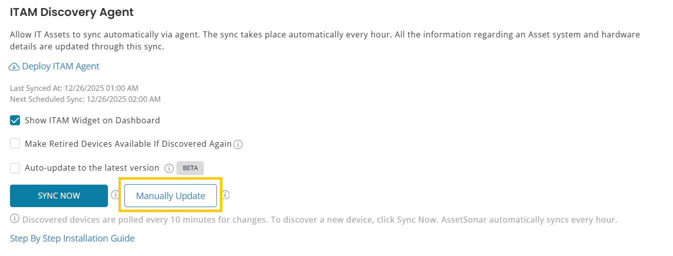 Go to Settings → Company Settings & Addons → ITAM Discovery Agent to see when the last sync took place, and when the next one is scheduled.