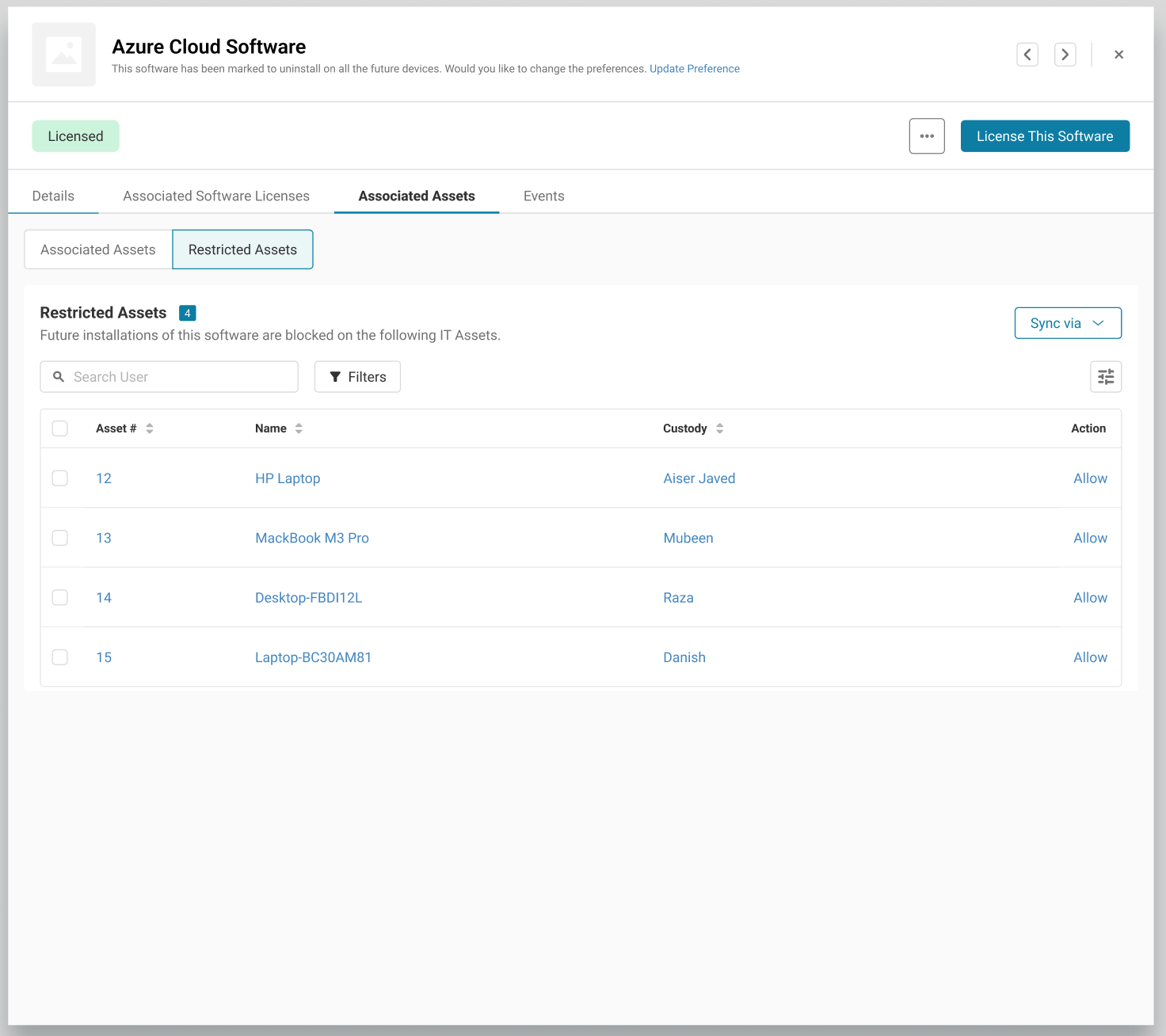 All assets where future installations are blocked will appear under a new Restricted Assets sub-tab within the Associated Assets tab of the software detail page. Each asset listed here includes an Allow action that lets you lift the restriction after confirmation.