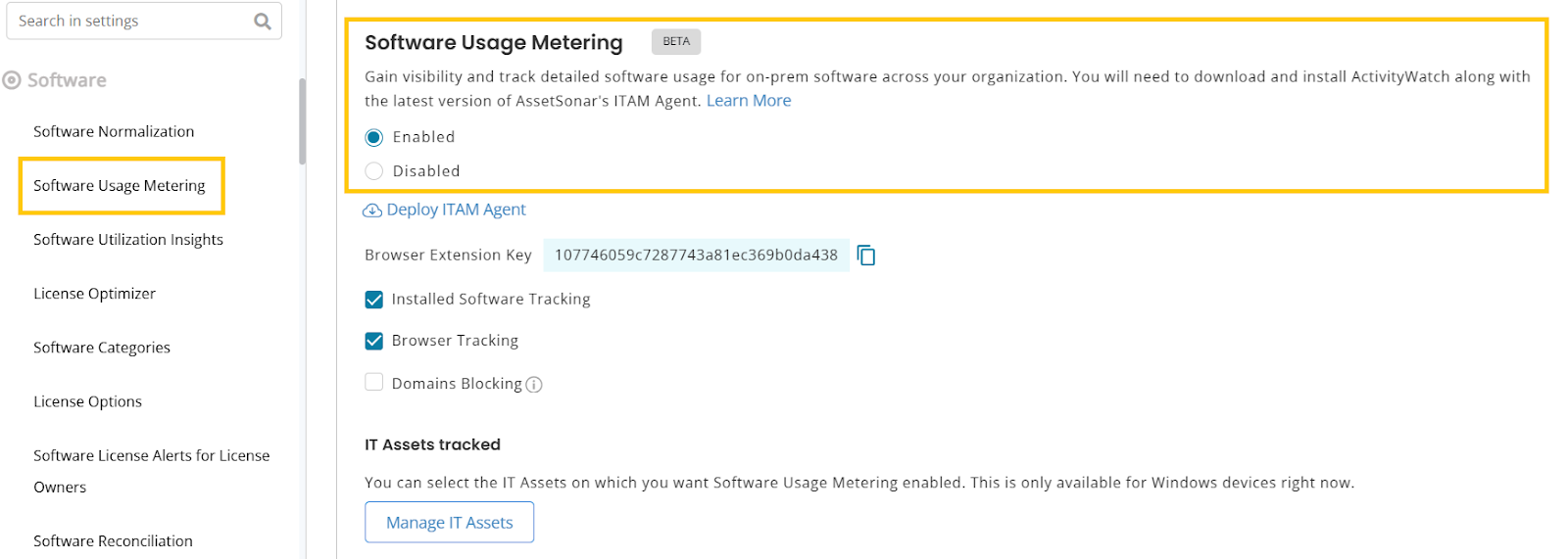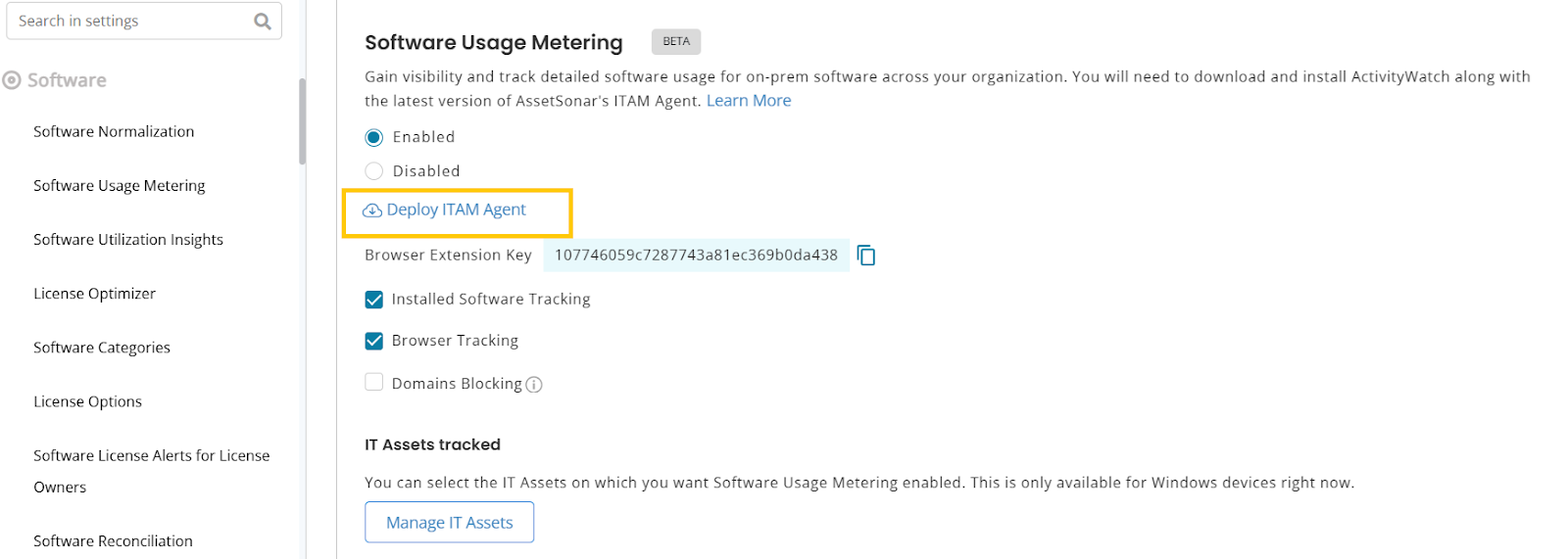 To begin capturing software usage data, you need AssetSonar ITAM Agent for Windows Version 3.2.0.0 or above. You can find the complete details on deploying AssetSonar ITAM Agent here.