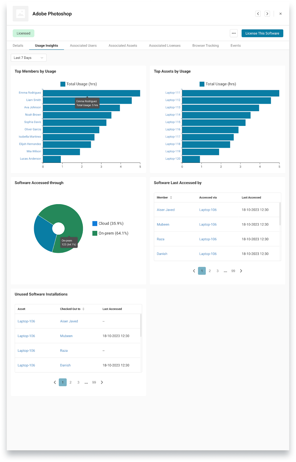 - Software Last Accessed By – Table of users with timestamps and devices.