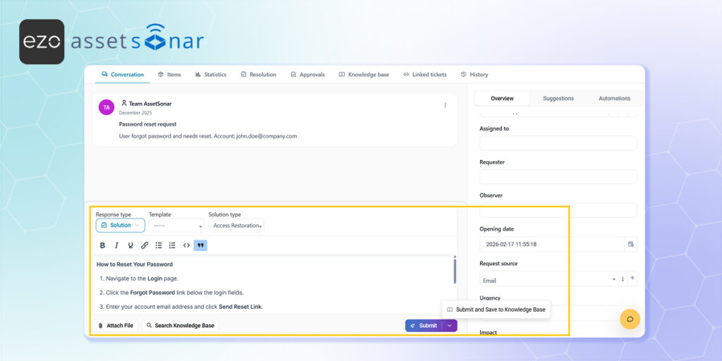 Converting a well-documented ticket resolution directly into a KB article prevents your team from having to rewrite solutions from scratch. This allows you to rapidly and organically grow your knowledge base using real-world fixes.
