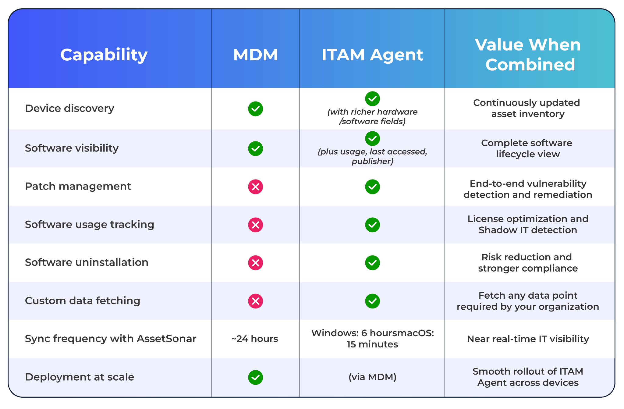 Both MDMs and the ITAM Agent can discover devices and installed software and update them on AssetSonar. The difference lies in depth, frequency, and the actionability of the information.