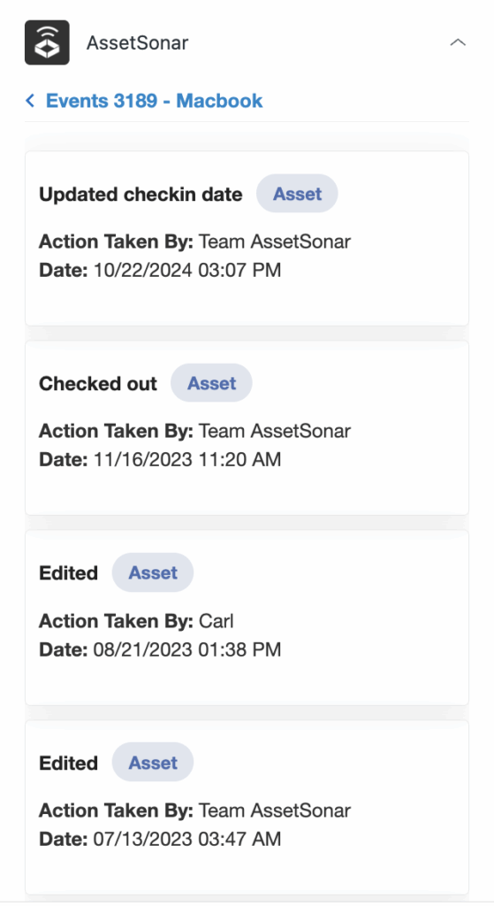 This opens a detailed view showing all logged activities for that item, identical to what you see under the Events tab on the AssetSonar web app.