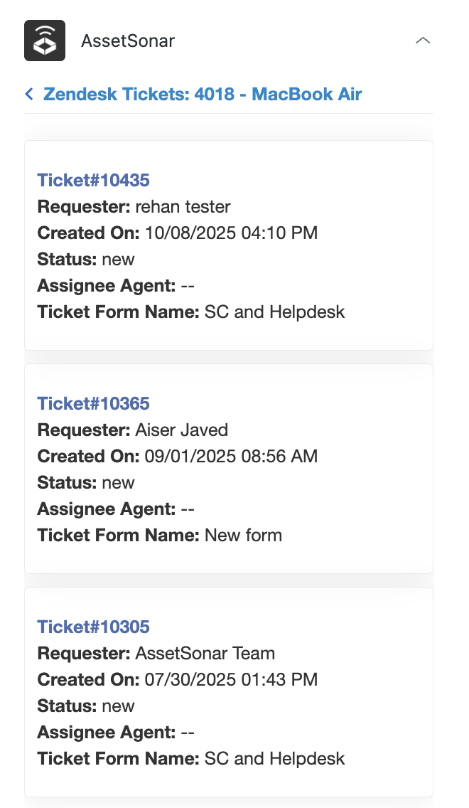 Agents can now view an asset’s events directly from the AssetSonar app within Zendesk.
