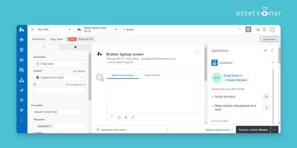 Let’s take an example of a broken laptop screen ticket. The options on the AssetSonar application such as out-of-stock, upcoming items reservations, linked items, or linked purchase orders are translated into French. The action buttons – ‘Keep ticket open’ and ‘Send as opened’ are also translated.